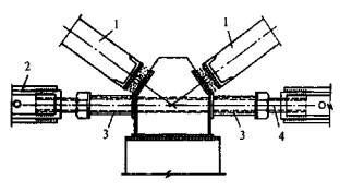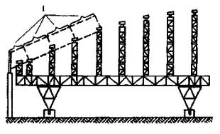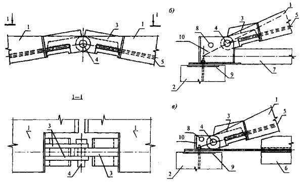 1 - укрупненные монтажные блоки Рисунок 7.11 - Схема инвентарного передвижного кондуктора для монтажа свода 7.30 В крайних складках сводов, примыкающих к торцам перекрываемых зданий, в плоскости швов между панелями через каждые две панели, но не более чем через 7 м, следует устанавливать жесткие затяжки-распорки из двух уголков, предельная гибкость которых должна быть не более 200. Конструкция примыкания складок к торцевым стенам не должна препятствовать их вертикальным перемещениям. 7.31 В многопролетных сводах рекомендуется применять опорные фермы, воспринимающие опорные реакции сводов двух смежных пролетов. Верхние пояса ферм, к которым примыкают опорные панели сводов, имеют наклонные плоскости с обеих сторон. Затяжки в опорных фермах смежных пролетов рекомендуется закреплять в соответствии с рис. 7.12.
