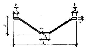 1 - опорные панели; 2 - муфта; 3 - труба или полый цилиндр; 4 - стержень с резьбой на двух концах Рисунок 7.12 - Закрепление затяжек смежных пролетов в опорных фермах 7.32 В сводах пролетом не более 24 м при ширине складок 6 м и высоте их поперечного сечения не более 1 м складки проектируются с двумя затяжками, расположенными в одном уровне в опорном сечении. 7.33 Подвески, воспринимающие усилия от грузоподъемного оборудования (кран-балок, тельферов, транспортерных галерей и т.п.), рекомендуется крепить к накладкам из листовой стали, соединяющим панели на гребнях складок. Своды с трапециевидным поперечным сечением складок 7.34 В сводах с трапециевидным очертанием поперечного сечения складок (рис. 7.3, б, тип 2 и рис. 7.13) ширину складок b, исходя из условия транспортирования элементов, рекомендуется принимать не более 3 м, высоту поперечного сечения h - от 1/4 до 1/6b и ширину горизонтальных полок b1 - от 1/8 до 1/10b в зависимости от величины перекрываемого пролета. Длину прямолинейных элементов сводов рекомендуется принимать в пределах от 2 до 6 м.