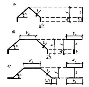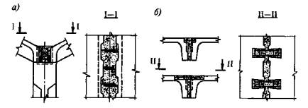 Рисунок 9.15 - Складчатые оболочки из бортовых балок, арок-диафрагм и плоских ребристых или гладких плит 9.2.31 Каждый тип конструкции имеет свои преимущества и недостатки, связанные с изготовлением, транспортированием, монтажом и особенностями конструирования. Предварительное напряжение бортовых балок и затяжек диафрагм при выполнении их отдельно от оболочки или складки (рис. 9.14, а и 9.15) осуществляется заранее на заводе, а при членении по схеме рис. 9.14, б - на месте строительства. При членении оболочки по схеме рис. 9.14, б перед установкой на леса сборные элементы объединяют попарно в направлении волны оболочки, сваривая закладные детали криволинейных ребер и устанавливая временные затяжки между бортовыми элементами. 9.2.32 Элементы конструкций при членении по схемам рис. 9.14 а, и 9.15 могут проектироваться из разных материалов: бортовые балки и диафрагмы - из бетонов высоких марок с использованием предварительного напряжения; элементы оболочек могут изготовляться из легких или ячеистых бетонов и выполнять при этом кроме несущих и ограждающих функций функцию теплоизоляции. 9.2.33 Конструкция стыка между элементами в сборных оболочках и складках выбирается согласно рекомендациям п. 6.4 настоящего СП в зависимости от характера и величины передающихся через стык усилий. В средней части оболочек и складок в нормальных сечениях действуют сжимающие и небольшие сдвигающие усилия. Стыки здесь решаются путем замоноличивания шпоночных швов бетоном с вибрированием. 9.2.34 В нормальных сечениях бортовых элементов действуют значительные растягивающие усилия. При устройстве стыков в этих сечениях (рис. 9.14, б) их целесообразно осуществлять предварительно напряженными, используя напрягаемую арматуру в качестве расчетного армирования. Арматура размещается в специально оставленных в элементах каналах и закрепляется по торцам оболочки. При натяжении арматуры обжимаются как сами элементы, так и стыки между ними. Для обеспечения совместной работы предварительно напряженной арматуры с бетоном каналы заполняются цементным тестом под давлением. 9.2.35 В продольных сечениях оболочек и складок кроме сдвигающих и незначительных нормальных сил действуют изгибающие моменты и сопутствующие им перерезывающие силы. При устройстве здесь стыков помимо заполнения бетоном шва между элементами должна обеспечиваться передача растягивающих усилий стыкованием арматуры ребер соединяемых элементов. При большой ширине шва арматура может соединяться сваркой выпусков, при малой - наиболее целесообразно соединение с помощью накладок через закладные детали сборных элементов. 9.2.36 В местах соединения собственно оболочки или складки с бортовыми балками и диафрагмами по схеме разрезки на рис. 9.14, а и 9.15 действуют значительные сдвигающие силы и изгибающие моменты (в отдельно стоящих конструкциях величина последних незначительна). В сборных элементах со стороны стыка устраиваются специальные углубления и выпуски арматуры с тем, чтобы после замоноличивания образовывались пересеченные арматурой шпонки, препятствующие их смещению (рис. 9.16, а). 9.2.37 Арматуру смежных элементов необходимо соединять также в стыках, расположенных в угловых зонах оболочек и складок, где действуют значительные по величине главные растягивающие усилия. Арматуру можно соединять сваркой вы