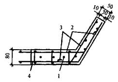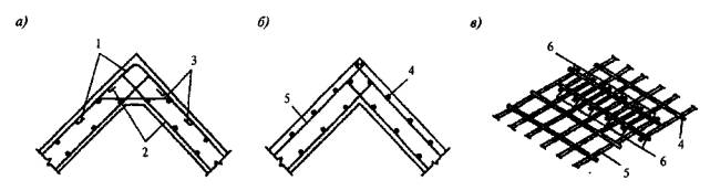 1 - предварительно напряженная арматура; 2 - поперечные стержни; 3 - верхние стержни и их заделка; 4 - сетка Рисунок 8.4 - Деталь армирования полки и стенки в торцевой зоне самозаанкерования предварительно напряженной арматуры 8.13 Жесткие узлы сопряжения граней сборных и монолитных складок рекомендуется конструировать как входящие углы железобетонных конструкций с применением пересекающихся стержней или сеток (рис. 8.5) для того, чтобы растянутые стержни имели требуемую длину заделки согласно п. 8.3.21 СП 52-101.