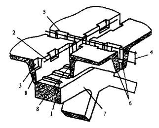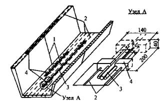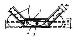 1 - бетон замоноличивания; 2 - отгибаемые и свариваемые выпуски; 3 - предварительно напряженная арматура, натягиваемая на упоры формы; 4 - дополнительные сетки Рисунок 8.6 - Армирование узла складок, изготавливаемых погибом до его замоноличивания 8.15 Сборные балочные складки трапециевидной или треугольной формы сечения рекомендуется проектировать из отдельных по длине элементов, соединяемых на месте строительства. Стыки таких элементов следует предусматривать в менее напряженных участках складки, в плоскостях, перпендикулярных продольной оси складки. Минимальная ширина замоноличенного шва принимается с учетом диаметра стыкуемых стержней и конструкции их соединения, но не более 250 мм. Стыки сборных складок с ненапряженной арматурой, расположенные в зонах действия изгибающих моментов, проектируются с применением сварки выпусков арматуры и последующего замоноличивания шва. Стыки складок с предварительно напряженной арматурой допускается проектировать шириной не менее 40 мм и не более шага поперечной арматуры в стенках складки без выпусков ненапряженной арматуры. При этом продольная предварительно напряженная арматура складки с натяжением на бетон располагается в пазах или каналах с последующим их замоноличиванием или инъецированием. 8.16 Стыки в складках трапециевидного сечения, собираемых из предварительно напряженных элементов (рис. 8.7), рекомендуется проектировать приторцованными (допускаемые отклонения зазора касания от проектного не более 0 ÷ +3 мм) с промазкой стыкуемых поверхностей эпоксидным клеем с мелким наполнителем и последующим обжатием с помощью предварительно напряженных арматурных вставок, размещаемых в растянутой зоне складки. Вставки следует принимать из стержневой горячекатаной стали классов А600, А800 с механическим или электротермическим натяжением, выполняемым согласно СП 52-102.