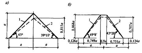 1 - линия стыка; 2 - предварительно напряженная арматура элемента; 3 - предварительно напряженные вставки; 4 - анкерные колодки Рисунок 8.7 - Конструкция предварительно напряженного стыка элементов балочных складок 8.17 Формы поперечного сечения призматических складок треугольного и трапециевидного сечений выбираются из условий производства работ, требований архитектурной выразительности, а также с учетом следующих особенностей: трапециевидные складки с горизонтально направленными полками в сжатой зоне меньше склонны к потере устойчивости наклонных стенок и имеют существенно больший момент инерции, чем треугольные той же высоты; трапециевидные складки с полками только в растянутой зоне удобнее для их опирания и требуют меньше поперечной арматуры на монтажные усилия; их недостатком является необходимость замоноличивания стыка между складками по низу лотка, отводящего с покрытия воду; замоноличенный стык треугольных складок рекомендуется делать только по верхней кромке; целесообразно выполнять трапециевидные складки с полками в сжатой и растянутой зонах с замоноличиванием стыка в сжатой зоне. Наклон и ширину полок рекомендуется выбирать методами оптимального проектирования. Оптимальными являются сечения, обеспечивающие наибольшую жесткость складки для заданной площади сечения. При совместном действии полезной равномерно распределенной нагрузки и собственного веса оптимальное поперечное сечение должно иметь форму, занимающую промежуточное положение между очертаниями складок, приведенными на рис. 8.8, отвечающими оптимальным поперечным сечениям только для нагрузки, равномерной по площади покрытия (очертание 1), и для нагрузки собственного веса складки (очертание 2).