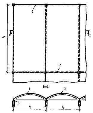 а - в направлении l2; б - в направлении l1, 1 - бортовая балка; 2 - ферма-диафрагма; 3 - оболочка; 4 - колонна; 5 - шов Рисунок 6.8 - Пример решения температурного шва 6.6.2 Покрытия с круглым или полигональным планом (оболочки вращения, складчатые купола и т.п.) диаметром более 40 м, в которых не могут быть предусмотрены деформационные швы, должны опираться по контуру на гибкие колонны или подвижные опоры в радиальном направлении, допускающие компенсацию температурных и усадочных деформаций. 6.6.3 В распорных покрытиях пролетом более 40 м, опирающихся жестко или шарнирно непосредственно на фундаменты, температурно-усадочные деформации рекомендуется учитывать как при расчете, так и при конструировании. 7 СводыОсновные положения7.1 Своды представляют собой несущую железобетонную пространственную конструкцию покрытия в виде изогнутой вдоль оси гладкой или волнистой плиты, обладающей распором и работающей на сжатие с изгибом. Сводчатые покрытия проектируются, как правило, из сборных железобетонных элементов для прямоугольных в плане однопролетных или многопролетных зданий. По продольным краям (вдоль образующей) своды могут опираться на колонны, стены или непосредственно на фундаменты. Распор сводов воспринимается затяжками (рис. 7.1) из стали или железобетона, поперечными стенами, рамами, контрфорсами или фундаментами (рис. 7.2). При проектировании сводов следует учитывать податливость элементов или конструкций, воспринимающих распор. Уменьшение податливости поперечных стен, контрфорсов и фундаментов может быть обеспечено установкой затяжек, расположенных ниже уровня пола.