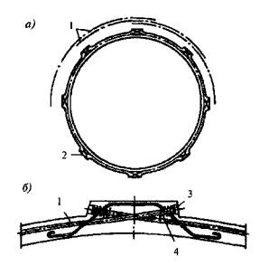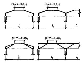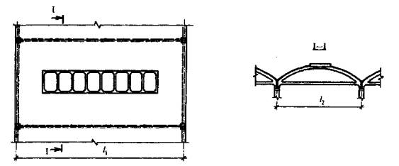 Рисунок 9.12 - Диафрагмы цилиндрических оболочек 9.2.21 Фонарные проемы и другие отверстия рекомендуется располагать в верхней части оболочки в продольном направлении. Размер отверстий в поперечном направлении рекомендуется назначать не более (1/4-1/3)l2, в продольном направлении размеры отверстий не ограничиваются. Отверстия в оболочках окаймляются рамками и усиливаются через 2-3 м распорками (рис. 9.13).
