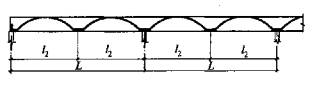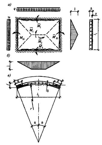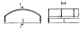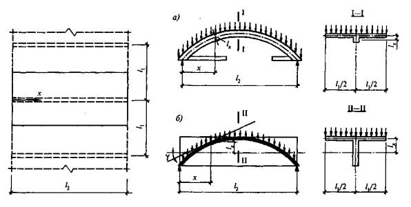 Рисунок 9.17 - К расчету бортового элемента короткой цилиндрической оболочки В средних пролетах короткой многопролетной монолитной одноволновой оболочки растягивающее усилие Nб в пролете бортового элемента уменьшается вдвое. В многоволновых оболочках величина усилия в бортовом элементе должна быть увеличена пропорционально увеличению нагрузки, приходящейся на этот элемент от обеих примыкающих к нему волн. 9.3.3 Нормальное усилие N по сечению оболочки в середине пролета l2 допускается определять по безмоментной теории. Полученную таким образом величину продольной силы можно использовать при расчете промежуточных диафрагм. Крайние диафрагмы или диафрагмы отдельно стоящей оболочки рассчитываются на воздействие половины этого усилия. 9.3.4 При расчете диафрагм их сечение принимается тавровым (рис. 9.18). В многопролетных оболочках ширину полки принимают равной расстоянию между диафрагмами l1. При этом оболочки параллельно диафрагмам как бы рассекаются посередине пролетов сечениями (рис. 9.18, а). В многоволновой несущей конструкции диафрагма с прилегающими к ней частями смежных оболочек делится на не связанные между собой отдельные волны. Если диафрагмы арочные, то в расчетной схеме разрезаются их затяжки, после чего остаются отдельные пролеты балочных диафрагм, связанные с прилегающими к ним частями оболочек (рис. 9.18). Усилия в сечениях такой конструкции определяются как в балке с прямолинейной или криволинейной осью.
