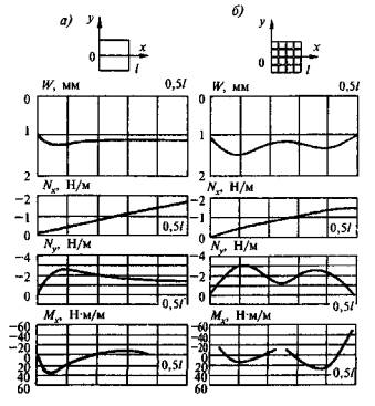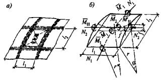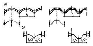 а - полная схема усилий; б - усилия, учитываемые при расчете Рисунок 9.4 - Усилия, действующие в длинных цилиндрических оболочках и складках Силы N, действующие нормально к площадкам продольного сечения, а также возникающие на тех же площадках поперечные силы Q учитываются в расчете, но не оказывают непосредственного влияния на подбор сечений. Размеры сечений определяются в первую очередь величинами нормальных усилий N1, действующих на площадках поперечного сечения, скалывающими усилиями S и изгибающими моментами М, возникающими на площадках продольного сечения оболочки или складки. 9.2.2 В ряде частных случаев (например, в конструкциях, опертых по углам, при действии равномерно распределенной нагрузки и большой величине отношения l1/l2 при большой жесткости поперечных ребер и др.) взаимное влияние поперечных изгибающих моментов и продольных нормальных усилий отсутствует или настолько незначительно, что для упрощения расчета ими можно пренебречь и рассчитывать оболочки и складки как балки криволинейного поперечного сечения. В каждом отдельном случае применение упрощенных методов расчета должно быть мотивированным. 9.2.3 В многоволновых покрытиях при конструкциях, опертых по углам, крайние полуволны можно приближенно рассчитывать как полуволны одноволновой оболочки или складки, имеющей симметричное сечение (рис. 9.5, а). Средние волны многоволновых оболочек и складок можно приближенно рассчитывать как оболочки (складки), у которых продольные края закреплены от смещений в горизонтальной плоскости и поворота в плоскости поперечного сечения (рис. 9.5, б).