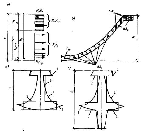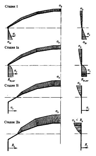 где М - изгибающий момент от внешних нагрузок в расчетном поперечном сечении оболочки или складки; h0 - рабочая высота сечения оболочки или складки, равная полной высоте за вычетом расстояния от нижней грани бортового элемента до равнодействующей усилий в растянутой арматуре. 9.2.9 Поперечную арматуру плиты и арматуру поперечных ребер на участках, примыкающих к бортовым элементам, определяют согласно СП 52-101 по усилиям из расчета оболочек и складок как упругих систем. В средней части сечения значения полученных из такого расчета отрицательных моментов увеличиваются на 25-30 %. 9.2.10 Изгибающий момент Мсrс при образовании трещин (стадия Iа на рис. 9.7) определяют без учета неупругих деформаций растянутого бетона как для сплошного упругого тела по пп. 7.28, 7.29 СП 52-101 или с учетом неупругих деформаций растянутого бетона с учетом следующих положений: сечения после деформирования остаются плоскими; эпюру напряжений в сжатой зоне бетона принимают треугольной формы как для упругого тела (рис. 9.8); эпюру напряжений в растянутой зоне бетона принимают трапециевидной формы с напряжениями, не превышающими расчетных значений сопротивления бетона растяжению Rbt,ser; относительную деформацию крайнего растянутого волокна бетона принимают равной ее предельному значению εbt2 при кратковременном действии нагрузки; при двухзначной эпюре деформаций в сечении элемента εbt2 = 0,00015; напряжения в арматуре принимают в зависимости от относительных деформаций как для упругого тела. В предварительно напряженных конструкциях момент образования трещин находят в соответствии с п. 4.2.2 СП 52-102.