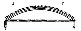 Если при этом в каком-либо продольном сечении оболочки изгибающий момент соответствует предельному, то в нем образуется пластический шарнир. С ростом нагрузки момент в сечении сохраняет постоянную величину, равную предельному моменту. Если же в плите образуется три продольных пластических шарнира при нагрузках меньше расчетных, то поперечная арматура должна быть усилена. 9.2.14 Если момент внутренних сил Mult более чем на 5 % отличается от момента внешних сил М, возникающего от расчетных нагрузок, то количество основной растянутой арматуры должно быть скорректировано и произведен перерасчет. Количество поперечной арматуры, принятой по результатам предварительного расчета, корректируется с учетом расчетных усилий при наличии трещин в поперечных и продольных сечениях оболочки. 9.2.15 Усилия в угловых зонах оболочек и складок рассчитываются как для упругих систем. Во избежание хрупкого разрушения оболочек и складок в углах от скалывания величина скалывающих напряжений не должна превышать 2,5Rbt. На участках, где напряжения скалывания больше указанной величины, необходимо осуществлять местное утолщение плиты. При этом производить перерасчет конструкции не требуется. 9.2.16 Диафрагмы рассчитываются как плоские стержневые или балочные конструкции. Нагрузкой на них являются собственный вес и опорное давление, передаваемое в виде сдвигающих сил S (рис. 9.9). Эти силы являются касательными к срединной поверхности оболочки или складки, обратными по направлению и равными по величине сдвигающим усилиям в оболочке на контуре. Величина сдвигающих сил определяется из расчета оболочек и складок как упругих систем. При расчете диафрагм следует учитывать эксцентричное приложение сдвигающих сил по отношению к оси элементов конструкции.