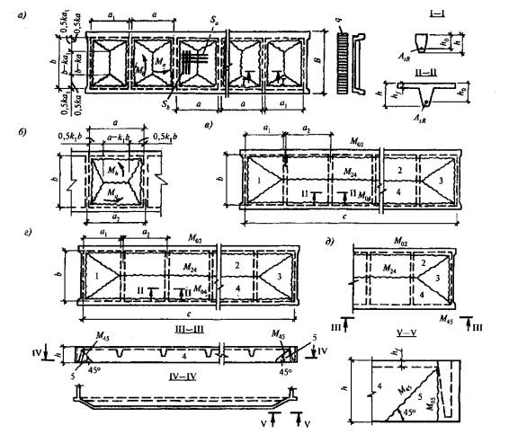 Рисунок 9.10 - Ребристая оболочка 9.2.19 Бортовые элементы, в которых размещается основная растянутая арматура, существенно снижают величину напряжений растяжения, уменьшают вертикальные и горизонтальные перемещения краев оболочки. Выбор типа бортовых элементов зависит в основном от условий опирания краев оболочки. Бортовые элементы для оболочек со свободно висящими краями рекомендуется принимать в виде балок, расположенных ниже края оболочки (рис. 9.11, а). Для сборных конструкций балки в целях снижения их массы могут быть двутаврового сечения. При необходимости бортовые элементы могут располагаться выше края оболочки (рис. 9.11, б). Они выполняются прямоугольного сечения (возможно, с приливами) или L-образного сечения (рис. 9.11, в). Если края оболочки (складки) подперты, то бортовой элемент целесообразно проектировать в виде горизонтальной плиты (рис. 9.11, г). Размеры сечений бортовых элементов определяются расчетными и конструктивными соображениями. Примерные размеры сечений этих элементов в долях от полной высоты сечения оболочки приведены на рис. 9.11. Примерную высоту сечения бортовых элементов в долях пролета l1 рекомендуется принимать равной 1/20-1/30. Промежуточные бортовые элементы, соединяющие отдельные волны многоволновых оболочек, проектируются обычно аналогично крайним бортовым элементам по одному из типов, изображенных на рис. 9.11.