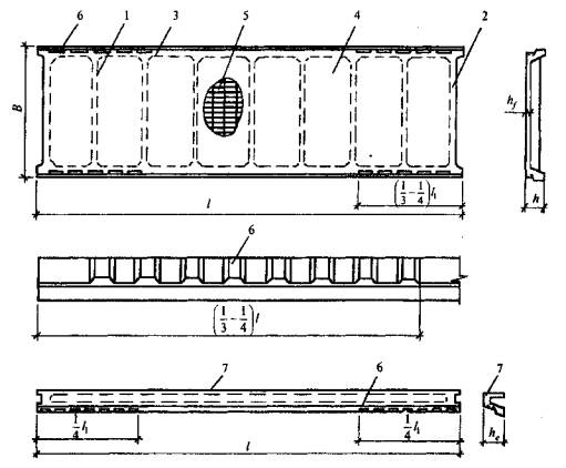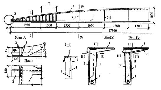 а - из секций шириной 6 м; б - то же, шириной 1,5 - 3 м; в - опорный узел; г - свод из складчатых ребристых панелей; 1 - рядовые панели; 2 - опорные панели; 3, 4 - предварительно напряженные железобетонные или стальные затяжки; 5 - подвески; 6 - накладки; 7 - отверстие для затяжки Рисунок 7.8 - Полигональные своды из ребристых плит 7.19 Опорные фермы (рис. 7.10) следует рассчитывать на нагрузку от вертикальной опорной реакции складки свода. Принимается, что половина этой реакции приложена в виде сосредоточенной силы в коньковом узле фермы, в котором закреплена верхняя пара затяжек, а остальная часть опорной реакции передается непосредственно на колонны, над которыми установлены нижние затяжки. При расчете верхнего пояса фермы следует учитывать также распределенную нагрузку его собственного веса, нагрузки опорных панелей и плит продольного карниза. Опорную ферму допускается рассчитывать как раму с затяжкой с учетом жесткости конькового узла. 7.20 Жесткость поперечных сечений крайних складок или волн сводов, примыкающих к торцевым стенам и деформационным швам, должна обеспечиваться затяжками-распорками (см. п. 7.30), диафрагмами, ребрами или другими конструктивными мероприятиями. 7.21 Расчетные усилия в элементах сводов на нагрузки и воздействия в период изготовления, перевозки и монтажа определяются с учетом рекомендаций п. 4.2.2 настоящего СП. Конструирование сборных сводовКонструирование цилиндрических и призматических (полигональных) сводов 7.22 Сборные цилиндрические своды проектируют из цилиндрических ребристых, а полигональные - из плоских ребристых плит. При членении цилиндрических сводов по поперечному сечению на два элемента их рекомендуется проектировать трехшарнирными. При большем количестве сборных элементов своды, как правило, проектируются двухшарнирными. Разновидностью цилиндрических сводов являются сегментные своды, собираемые из панелей-оболочек КЖС и проектируемые согласно рекомендациям, приведенным в разделе 14.2 настоящего СП. 7.23 Полигональные своды рекомендуется проектировать из ребристых плит, изготовляемых в формах для типовых плит, с размерами сторон 1,5×6 м или 3×6 м (рис. 7.8, а, б). Ребра плит по краям каждой монтажной секции должны обеспечивать прочность и жесткость свода. Возможно применение также складчатых панелей с переломами поверхности полки и изломами ребер в продольном направлении для образования конструкции трехшарнирного свода (рис. 7.8, г). В полигональных сводах к стержням рабочей арматуры ребер в углах панелей следует приваривать закладные детали, которые в пределах каждой секции должны соединяться между собой накладками, обеспечивающими непрерывность армирования ребер в пределах всего перекрываемого пролета. Торцы плит, примыкающих к опорам, должны быть запроектированы с учетом устройства отверстий для пропуска затяжек и образования плоскостей для опирания сводов на опорные конструкции (рис. 7.8, в). Цилиндрические и полигональные своды рекомендуется проектировать с учетом возможности их монтажа укрупненными элементами, длина которых равна величине перекрываемого пролета. Конструирование складчатых сводовСводы с треугольным поперечным сечением складок 7.24 Складчатые своды с треугольным очертанием сечения (рис. 7.3, б, тип 1) рекомендуется проектировать из трапециевидных железобетонных ребристых п