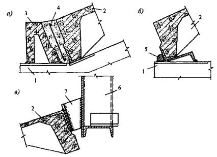 а - отдельными стержнями; б - сварными сетками; в - положение сеток при сварке; 1 - верхние стержни; 2 - то же, нижние; 3 - армирование в вутах; 4 - поперечные стержни пересекающихся сеток; 5 - то же, продольные; 6 - места точечной сварки Рисунок 8.5 - Армирование пересекающимися стержнями жесткого сопряжения граней треугольной складки 8.14 С целью упрощения конструкции форм и процесса бетонирования элементов сборных складчатых покрытий изготовление складок может предусматриваться на плоских шарнирных поддонах с последующим изгибанием. В этом случае паз с пересекающей его неразрезной арматурой оставляют незабетонированным (рис. 8.6). После погиба граней до заданного угла наклона могут быть произведены сварка арматуры и установка дополнительных стержней и сеток, а затем замоноличивание узла бетоном прочностью не ниже прочности бетона граней. Предварительно напряженная арматура может натягиваться на упоры или на бетон и располагаться в бетоне замоноличивания.