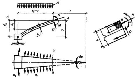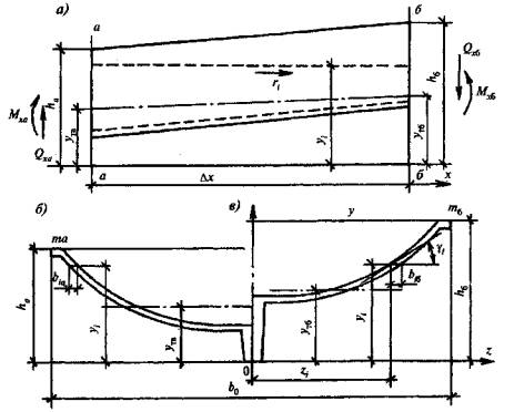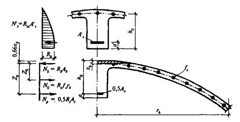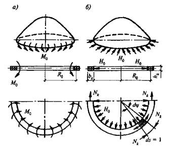 а - арочной; б - балочной Рисунок 9.18-К расчету диафрагмы короткой оболочки Для расчета собственно диафрагм надо определить усилие, приходящееся на оболочку, при этом изгибающими моментами и поперечными силами в сечении оболочки можно пренебречь. Полное нормальное сжимающее усилие для крайней диафрагмы, когда примыкает лишь один полупролет оболочки, по формуле