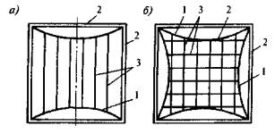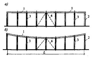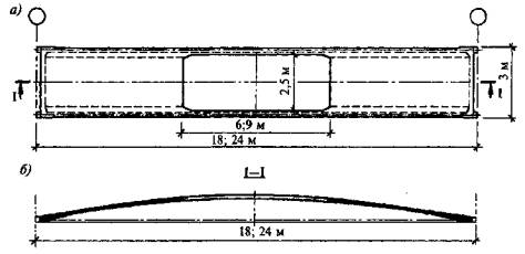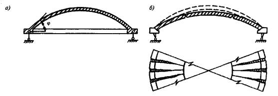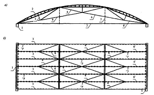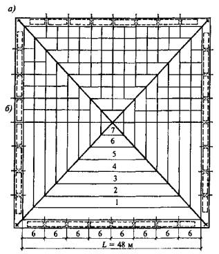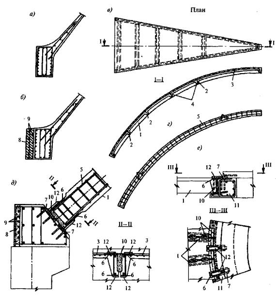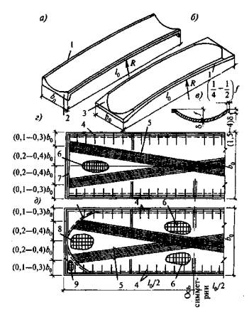 где fy, fx, finc - соответственно сечения продольной, поперечной и косой арматуры плиты; Rs,inc - расчетное сопротивление косой арматуры плиты. Вводимые в расчет сечения продольной и поперечной арматуры не должны различаться более чем на 20 %. Косая и поперечная арматуры, воспринимающие главные растягивающие усилия, заделываются в бортовой элемент. Выше нейтральной оси дополнительная косая и поперечная арматуры продлеваются не менее чем на 20 диаметров за сечение, где главные растягивающие напряжения могут быть восприняты основной сеткой. 9.2.29 В целях экономии арматуры, а также повышения трещиностойкости и жесткости конструкции арматуру бортовых элементов оболочек и арматуру затяжек диафрагм целесообразно выполнять предварительно напряженной. 9.2.30 Сборные цилиндрические оболочки собираются либо из бортовых балок длиной на пролет, криволинейных ребристых панелей длиной на пролет волны и затяжек диафрагм (рис. 9.14, а), либо из криволинейных ребристых панелей с примыкающими к ним частями бортовых балок длиной на половину пролета волны и затяжек диафрагм (рис. 9.14, б); складчатые оболочки собираются из бортовых балок длиной на пролет, арок-диафрагм длиной на пролет волны и плоских гладких или ребристых плит (рис. 9.15). Верхним поясом диафрагм в оболочках служит усиленное ребро крайних панелей. Панели приняты размерами 3×6 и 3×12 м.