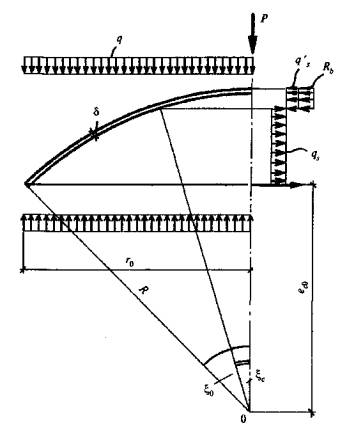Рисунок 7.4 - Расчетная схема свода При очертании оси сводов по дуге окружности (рис. 7.4) R0, φ, у, s определяются по формулам: