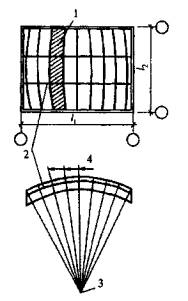 Рисунок 9.6 - Схема трещин в длинной цилиндрической оболочке Для расчета длинных цилиндрических оболочек по образованию и раскрытию трещин, жесткости и прочности используется тот же метод расчета с учетом деформаций поперечного контура, что и для упругой системы. 9.2.5 В работе нормальных сечений оболочки или складки с ненапрягаемой арматурой, законструированных согласно рекомендациям настоящего раздела, с увеличением нагрузки от нуля до предельных значений можно различить следующие четыре стадии (рис. 9.7):