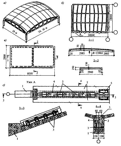 а - длинная цилиндрическая оболочка из панелей размером 3×6 м, бортовых элементов и диафрагм, монтируемая укрупненными элементами; б - то же, короткая из плоских панелей размером 3×12 м и диафрагм; в - оболочка вращения из трапециевидных криволинейных или плоских панелей; г - шатровые складки из трапециевидных и прямоугольных панелей; д - оболочки двоякой кривизны из панелей размером 3×6 м, монтируемые укрупненными элементами размером 3×18 м; е - волнистый свод из плоских панелей; ж - шатровая висячая оболочка (со средней опорой) из трапециевидных панелей; з - составная оболочка из четырех гиперболических параболоидов, собранных из неплоских панелей размером 3×9 м; и - стрельчатый свод-оболочка из гиперболических панелей с торцевой стенкой-диафрагмой; к - складчатое покрытие; 1 - панель; 2 - бортовой элемент; 3 - ферма-диафрагма; 4 - монтажный блок размером 3×18 м Рисунок 6.4- Примеры членения сборных пространственных покрытий и перекрытий 6.3.3 Поперечные сечения сборных элементов, как правило, должны иметь размеры, не менее: по толщине плиты 8-30 мм; по высоте сечения основных ребер панелей h - 1/20 их длины; по ширине сечения ребер панелей b - 40 мм. Бортовые балочные элементы следует конструировать, по возможности, аналогичными типовым железобетонным балкам покрытий и перекрытий, а бортовые растянутые элементы оболочек положительной гауссовой кривизны - с предварительно напряженной арматурой. Для бортовых элементов небольших пролетов допускается обычное армирование. 6.3.4 В местах действия краевых моментов и максимальных главных растягивающих напряжений плиту допускается утолщать, в том числе с помощью слоя монолитного бетона, укладываемого по сборным плитам. При этом должны быть предусмотрены необходимое дополнительное армирование монолитного слоя (например, в углах оболочек положительной гауссовой кривизны) и конструктивные и технологические мероприятия для надежного сцепления монолитного слоя со сборными панелями. Толщина плиты сборных элементов может быть переменной, плавно изменяющейся между ребрами, или ступенчатой, постоянной в пределах пролета. 6.3.5 Основная арматура сборных пространственных конструкций предусматривается в плите и ребрах панелей, бортовых балках, диафрагмах и других элементах покрытия или перекрытия. В случае, когда арматуры, установленной в сборных элементах, недостаточно, сборные пространственные конструкции могут иметь дополнительное армирование в виде предварительно напряженных поясов и отдельных элементов или стержней, укладываемых в процессе возведения конструкции. Предварительное напряжение такой арматуры осуществляется натяжением на бетон и последующим обетонированием. В стыках между панелями и другими элементами (например, для обеспечения неразрезности в местах сопряжения соседних оболочек) также допускается укладывать стержни или сетки дополнительного армирования. 6.3.6 Сборные конструкции в виде панелей-оболочек, панелей-складок (размером, равным пролету между опорами покрытий или перекрытий зданий) проектируют исходя из условия, что они изготовляются, перевозятся и монтируются как готовые пространственные конструкции. Соединения элементов при укрупнительной сборке должны быть достаточно простыми для выполнения, как правило, без замоноличивания. 6.3.7 В комбинированных пространственн