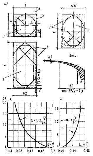 5.8 Арматура, расположенная внутри сечения конструкции, должна иметь защитный слой бетона (расстояние от поверхности арматуры до соответствующей грани конструкций), чтобы обеспечивать: - совместную работу с бетоном; - анкеровку арматуры в бетоне и возможность устройства стыков арматурных элементов; - сохранность арматуры от воздействия окружающей среды (в том числе при наличии агрессивных воздействий); - огнестойкость и огнесохранность. Минимальные значения толщины защитного слоя бетона для рабочей арматуры следует принимать по табл. 8.1 СП 52-101. 5.9 Во время пожара защитный слой бетона предохраняет арматуру от быстрого нагрева ее до критической температуры. Предел огнестойкости увеличивается, если применить огнезащитное покрытие. Известково-цементная штукатурка толщиной 15 мм, гипсовая - толщиной 10 мм, вермикулитовая - толщиной 5 мм или теплоизоляция из минерального волокна толщиной 5 мм эквивалентны увеличению на 10 мм толщины защитного слоя тяжелого бетона. Огнезащитные покрытия, применяемые для повышения предела огнестойкости конструкций, также могут иметь армирование. 6 Основные требования к конструированию6.1 Монолитные конструкции6.1.1 Монолитные пространственные конструкции проектируют, как правило, с гладкой плитой, толщина δ которой должна удовлетворять п. 8.2 СП 52-101. С целью повышения жесткости поля оболочки или складки допускается предусматривать ребра, как правило, прямоугольного или трапециевидного сечения. Шаг ребер определяют расчетом поля оболочки или плиты складки на прочность, устойчивость или локальную несущую способность (см. п. 5 настоящего СП). С целью уменьшения изгибающих моментов в плите оболочки и упрощения опалубки рекомендуется ось симметрии сечения ребер совмещать с направлением нормали к поверхности (а для ребер, располагаемых в местах перелома складчатой поверхности, - с направлением биссектрисы угла сопряжения граней). 6.1.2 Монолитные тонкостенные конструкции покрытий можно проектировать для любых очертаний поверхности и форм плана, предусмотренных п. 4.1.1 настоящего СП. С целью сокращения трудоемкости и стоимости опалубки рекомендуется применять тонкостенные конструкции, удобные для использования многократно оборачиваемой (подвижной и переносной) опалубки: с линейчатыми поверхностями (цилиндрические, гиперболические оболочки, коноиды, призматические складки); с поверхностями переноса положительной гауссовой кривизны (параболические и круговые оболочки). Стрелу подъема монолитных оболочек обычно принимают от 1/10 до 1/5 пролета. Угол наклона касательной к поверхности монолитных покрытий с горизонтом для их бетонирования на односторонней опалубке, как правило, должен быть не более 35°. 6.1.3 В качестве бортовых элементов оболочек, складок, многогранников рекомендуется предусматривать балки, рамы или арки, как правило, прямоугольного или квадратного сечения, высоту которых принимают не менее 1/80 пролета или фермы. 6.1.4 Переход от плиты к бортовым элементам (а также к ребрам) должен быть плавным в виде вута шириной до 10δ. Если устройство вута недостаточно для восприятия краевых изгибающих моментов, следует предусматривать соответствующие утолщения плиты на величину от 0,5δ до δ. В необходимых случаях, согласно требованиям расчета, плита может иметь плавное утолщение от центра к бортовым эл