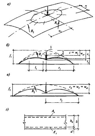 а - ребристых плит с бортовыми балками в отдельно стоящей складке между ребрами и в местах ребер; б - панелей в угловых зонах (со сваркой выпусков и со сварными каркасами, устанавливаемыми в углублениях сверху) Рисунок 9.16 - Стыки элементов сборных длинных цилиндрических оболочек и складок 9.3 Рекомендации по расчету коротких монолитных оболочек9.3.1 Короткие оболочки с пролетом l1 ≤ 12 м при соотношении l1/l2 < 0,5 могут конструироваться по результатам упрощенного расчета (см. п. 9.3.2 настоящего СП). Однако при значительных пролетах l2, малой толщине, тяжелых или сосредоточенных нагрузках, а также при 0,5 < l1/l2 ≤ 1 короткие оболочки требуется рассчитывать более точно. При приближенном расчете оболочек на равномерно распределенную нагрузку усилия в плите оболочки не определяются. Сечение и армирование плиты назначаются конструктивно (см. п. 9.3.6 настоящего СП). 9.3.2 Для наиболее часто применяемых коротких оболочек (с пролетами l1 ≤ 12 м; l2 ≤ 30 м) плечо внутренней пары продольных усилий (рис. 9.17) составляет 0,5÷0,61(f + d1). Поэтому растягивающее усилие Nб в одном бортовом элементе отдельно стоящей оболочки допускается определять по формуле
