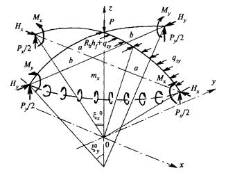 рекомендуется назначать большим, чем Ребристые оболочки при расчете устойчивости могут рассматриваться как ортотропные. В случае, когда размеры и расстояния ребер обоих направлений не слишком велики и мало отличаются друг от друга, ребристая оболочка может быть заменена для расчета фиктивной гладкой, имеющей ту же жесткость сечения на сжатие и тот же радиус инерции. При этом фиктивную толщину 6у определяют по формуле