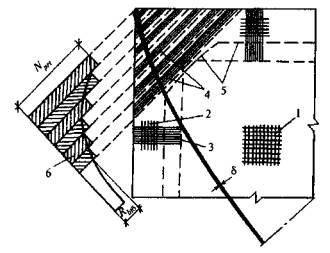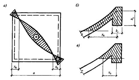 а - схема нагрузки и расчетная схема крайней волны; б - расчетная схема средней волны Рисунок 9.5 - К приближенному расчету многоволновых оболочек и складок 9.2.4 Длинные цилиндрические оболочки и складки по прочности, жесткости и трещиностойкости рекомендуется рассчитывать с учетом образования трещин в бортовых элементах и плите и трещин вдоль образующих в плите (или трещин в поперечных ребрах, которые в сборных конструкциях могут образовываться уже на стадии монтажа конструкции) в соответствии с методами, изложенными в Руководстве (приложение Б). Косые трещины в углах (рис. 9.6) практически не влияют на распределение усилий при эксплуатационных нагрузках в средних, расчетных сечениях оболочки (складки) и при расчете не учитываются. Расчет по образованию трещин в нормальных сечениях и вдоль образующих рекомендуется производить с учетом пластических деформаций в растянутой зоне бетона.