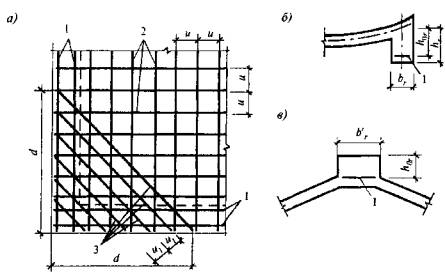 расстояние между ними не рекомендуется назначать больше, чем При наличии больших скалывающих напряжений на опорах рекомендуется, не утолщая всей оболочки или складки, делать местные утолщения у опор, которые при определении усилий не учитываются. Некоторые особенности конструирования 9.2.24 Продольную рабочую арматуру рекомендуется располагать в основном в нижней части бортовых элементов. При этом обеспечивается для заданного сечения оболочки или складки наибольшее значение плеча внутренней пары сил z. Часть арматуры располагается по высоте сечения бортовых элементов или в их верхней зоне. При бортовых элементах, располагаемых выше края оболочки (рис. 9.11, б, в), часть арматуры может размещаться в плите оболочки или складки. Кроме основной арматуры в бортовых элементах устанавливается поперечная и монтажная арматура. 9.2.25 По длине пролета как в однопролетных, так и в многопролетных оболочках не менее 30 % сечения растянутой арматуры доводится до опор. Сечение арматуры по длине пролета целесообразно уменьшать не обрывом стержней, а приваркой стержней меньшего диаметра к стержням большего диаметра. Места уменьшения сечения арматуры назначаются в соответствии с эпюрой изменения напряжений вдоль пролета, при этом стержни большего диаметра должны быть заведены на длину не менее 20d за сечение, где теоретически возможно уменьшение диаметра. 9.2.26 В неразрезных многопролетных оболочках кроме основной растянутой арматуры в пролете ставится арматура в верхней части оболочки для восприятия растягивающих напряжений над опорами (диафрагмами), которая располагается в средней половине растянутой части дуги. Не менее 50 % растянутой арматуры над опорой должно быть продлено на длину 1,2b0 в каждую сторону от диафрагмы (b0 - расстояние от опоры до сечения с нулевыми моментами). 9.2.27 Продольная арматура в сжатой зоне оболочки, а также на участках, где главные растягивающие напряжения меньше Rbt, устанавливается конструктивно через 15-25 см, площадью не менее 0,2 % сечения бетона. Вместе с поперечной арматурой, рассчитываемой на восприятие поперечных изгибающих моментов, она образует сетку. Сечение арматуры, необходимое для работы на поперечные моменты, определяется как для плит. По длине волны арматура сетки, воспринимающая поперечные моменты, устанавливается соответственно эпюре моментов - ближе к растянутой зоне. В местах примыкания плиты к бортовым элементам (а также к диафрагмам) устанавливаются двойные сетки из арматуры диаметром 5-8 мм и шагом не более 20 см. В ребристых оболочках поперечные моменты воспринимаются основной арматурой ребер. Ребра армируют обычно двойной арматурой, связанной поперечными стержнями. При этом плита армируется конструктивно одиночной сеткой. 9.2.28 На участках, где σprt > Rbt, сечение арматуры определяется растягивающими напряжениями, действующими под углом 45° к образующей. Величина этих напряжений определяется по формуле