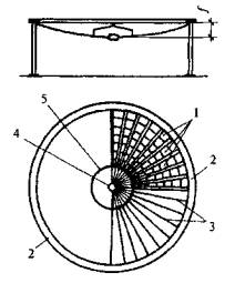 Рисунок 9.9 - Схема передачи усилий с оболочки на диафрагму Конструирование длинных цилиндрических и складчатых оболочекВыбор схемы и очертаний элементов цилиндрических оболочек 9.2.17 Высоту оболочки h, включая высоту сечения бортовой балки, рекомендуется назначать равной (1/6-l/8)l1, а стрелу подъема f равной (1/6-1/8)l2. Продольные края оболочки в пролете могут оставаться свободными или опираться на колонны или стены. Поперечное сечение оболочек может быть очерчено по дуге круга, эллипса или по другой кривой. Рекомендуется принимать круговое очертание как наиболее простое в производстве работ. Схемы сечений оболочек и складок приведены на рис. 9.1-9.3. 9.2.18 Сборные и сборно-монолитные цилиндрические оболочки обычно выполняют ребристыми. Монолитные оболочки предпочтительно делать гладкими, так как устройство ребер усложняет производство работ. Ребристые монолитные оболочки (рис. 9.10) рекомендуется применять лишь в тех случаях, когда вследствие наличия сосредоточенных нагрузок, особенностей очертания оболочки, условий ее опирания, больших пролетов или других причин поперечные изгибающие моменты настолько велики, что требуют для гладкой оболочки слишком большой толщины и устройства очень массивных бортовых элементов. Ребра в монолитной оболочке могут потребоваться также для обеспечения ее устойчивости.