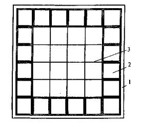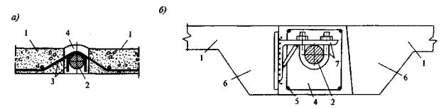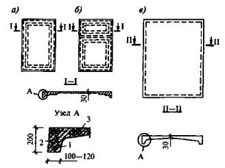1 - арматура; 2 - стык арматуры с перепуском на 30d или равнопрочный сварной стык Рисунок 6.7 - Окаймляющее армирование отверстий 6.5.3 В зоне отверстий плиты размером более 15δ края полок и стенок должны иметь утолщение и армирование, принимаемое по расчету. Утолщение должно иметь высоту ≥ 3δ, ширину ≥ 2δ и площадь бетона и арматуры не менее чем площадь бетона и арматуры в поперечном сечении вырезанной части плиты. Отверстия, устраиваемые в растянутых полках или стенках, должны иметь в ребрах количество арматуры, достаточное для восприятия усилия, приходящегося на вырезанную часть полки или стенки. 6.6 Деформационные швы6.6.1 В пространственных покрытиях и перекрытиях в соответствии с п. 8.2.3 СП 52-101 следует предусматривать их разрезку постоянными и временными температурно-усадочными швами, расстояние между которыми назначают в зависимости от климатических условий, конструктивных особенностей сооружения, последовательности производства работ и т.п. Кроме того: в многопролетных покрытиях швы следует устраивать между парными бортовыми элементами (рис. 6.8); в складчатых и волнистых сводчатых покрытиях деформационные швы, с целью повышения их водонепроницаемости, рекомендуется проектировать на гребне у складки или волны свода; температурно-усадочные деформации пространственных конструкций должны компенсироваться за счет гибких или качающихся колонн, а также катучих, скользящих или упруго-деформируемых (полимерных прокладок) опорных устройств. При больших (100 м и более) пролетах, как правило, применяют свободно податливые опоры при условии неподвижного закрепления покрытия не менее чем в двух точках по сторонам контура или в углах; деформационные швы покрытия должны совпадать со швами, перерезающими стены, если специально не предусмотрены мероприятия для независимого деформирования стен и покрытия.