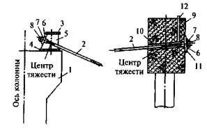 где Rs - расчетное сопротивление стали стержней-вставок; γs - коэффициент условий работы, учитывающий возможные эксцентриситеты и ослабления в зоне анкеровки стыковых стержней, принимаемый равным 0,8; М - изгибающий момент в сечении стыка; z0 - плечо внутренней пары; п - количество стержней; б) сечение стальных анкерных упоров на вставках и колодок рекомендуется определять: из условия смятия по контактным поверхностям согласно СП 53-102 по формуле