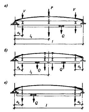 а - цилиндрические своды; б - складчатые своды (типы 1 и 2); в - волнистые своды (типы 1, 2, 3) Рисунок 7.3 - Поперечные сечения сводчатых покрытий По условиям изготовления элементов сборных сводчатых покрытий, удобству укладки утеплителя и устройства кровли цилиндрические и складчатые своды предпочтительнее волнистых. Сборные элементы сводчатых покрытий рекомендуется изготовлять с пароизоляционным слоем, утеплителем и слоем кровельного ковра. 7.5 Деформативность складчатых и волнистых сводов в продольном направлении позволяет проектировать их без температурно-усадочных швов. При этом продольный каркас здания, служащий опорой для сводов, должен быть рассчитан на температурные воздействия. В случае необходимости устройства в каркасе деформационных швов в сводах между складками или волнами также должны устраиваться швы, перекрываемые компенсаторами. Складки или волны сводов, примыкающие к деформационным швам, должны конструироваться с затяжками-распорками, диафрагмами и т.п., исключающими возможность деформации контура их поперечного сечения. 7.6 В сводчатых покрытиях могут быть предусмотрены проемы для зенитных светоаэрационных фонарей, вытяжных шахт и т.п. с учетом рекомендаций п. 6.5 настоящего СП. Допускается подвешивать к сводам кран-балки или другое грузоподъемное оборудование, а также трубопроводы, площадки и т.п. При этом сосредоточенные нагрузки рекомендуется прикладывать в местах расположения подкрепляющих ребер и переломов поверхности свода. 7.7 Своды рекомендуется проектировать из тяжелого или легкого бетона. Проектные классы бетонов назначаются по расчету с учетом рекомендаций п. 5 настоящего СП. Швы между сборными элементами сводчатых покрытий проектируются с замоноличиванием мелкозернистым бетоном класса по прочности на сжатие не менее В15. 7.8 Монолитные своды проектируются преимущественно цилиндрическими, очертание которых, по возможности, приближается к кривой давления от постоянной нагрузки. В сводах пролетом более 12 м следует предусматривать подкрепляющие ребра, расположенные в направлении перекрываемого сводом пролета. При проектировании монолитных сводов следует учитывать рекомендации п. 6.1 настоящего СП. Рекомендации по расчету сводов7.9 Своды рекомендуется рассчитывать как двухшарнирные или трехшарнирные тонкостенные арки (при наличии шарнирного стыка в ключе свода). Рассчитывается одна секция цилиндрического свода, складка или волна складчатого либо волнистого свода. При этом сечение складок или волн принимается недеформируемым. Работа крайних волн сводов в поперечном направлении учитывается согласно рекомендациям п. 7.20 настоящего СП. Своды по предельным состояниям рассчитываются согласно СНиП 52-01 и с учетом рекомендаций п. 4.2 настоящего СП. При расчете сводов величины нагрузок и воздействий принимают согласно СНиП 2.01.07. При расчете элементов, воспринимающих опорные реакции сводов (затяжки, опорные фермы, контрфорсы и т.п.), снеговая нагрузка принимается равномерно распределенной по всему пролету свода. Сосредоточенные нагрузки от подвесного грузоподъемного или другого оборудования, а также полосовые нагрузки рекомендуется полностью учитывать при расчете тех складок или волн свода, к которым они непосредственно приложены, без учета их взаимодействия со смежными складками или во