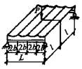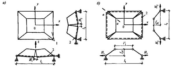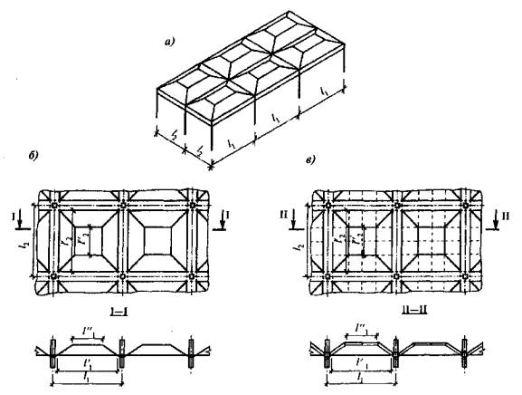 Рисунок 9.2 - Типы складчатых оболочек 9.1.2 Расстояние между осями опорных диафрагм l1 называется пролетом оболочки. Расстояние между бортовыми элементами l2 называется длиной волны. Высота оболочки, включая бортовые элементы, обозначается через h. Стрела подъема оболочки без бортовых элементов обозначается через f. Направление по образующей вдоль пролета l1 называется продольным, а по направляющей вдоль пролета l2 - поперечным. Многоволновые оболочки монолитно связаны между собой и имеют общие бортовые элементы (рис. 9.1, 9.2). При этом различают крайние и промежуточные бортовые элементы. Расстояние L между осями колонн, поддерживающих диафрагму (рис. 9.3), в общем случае может не совпадать с длиной волны оболочки (складки).