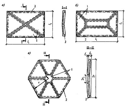 а - в куполе; б - в шатровой складке; в - в пологой оболочке положительной гауссовой кривизны, опертой по контуру; г - то же, с фермами-диафрагмами, опертыми в углах оболочки; д - в цилиндрической оболочке; е - в шедовой однопролетной оболочке; ж - в шедовой неразрезной оболочке, армированной перекрестными пучками; з - в зонтичной оболочке, образованной из четырех гиперболических параболоидов Рисунок 6.1 - Схемы расположения напрягаемой арматуры В бортовых элементах балочных оболочек и складок до 80 % основной растянутой арматуры допускается концентрировать у растянутой грани. В остальных случаях растянутую арматуру в тонкостенных элементах пространственных конструкций рекомендуется располагать, по возможности, равномерно вдоль растянутой зоны сечения оболочки, складки или многогранника. 6.2 Сборно-монолитные конструкции6.2.1 Сборно-монолитные конструкции покрытий и перекрытий можно проектировать с применением в качестве несущей опалубки (рис. 6.2) железобетонных или армоцементных тонкостенных элементов, обеспечивающих создание готовой поверхности потолка, удовлетворяющей архитектурно-конструктивным требованиям. При проектировании армоцементных элементов несущей опалубки следует соблюдать требования СНиП 2.03.03. Несущую опалубку пространственных конструкций рассчитывают на усилия от веса уложенного монолитного бетона и монтажных нагрузок с учетом ее последующей работы в качестве элемента составного сечения на эксплуатационные нагрузки. Поверхность несущей опалубки, соприкасающаяся с монолитным бетоном, и выпуски арматуры должны обеспечивать совместную работу опалубки и монолитного бетона.