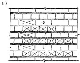 Применялись для всех видов несущих конструкций. В зависимости от формы камня и способа производства работ при возведении могут быть следующие виды кладки: а) кладка под скобу - из постелистого камня с подбором его по высоте в горизонтальных рядах и перевязкой с заполнением пустот мелким щебнем; б) кладка под лопату - из постелистого и рваного камня с перевязкой на густом растворе с подливкой его лопатой под каждый камень с заполнением пустот мелким камней и щебенкой; в) кладка под залив - из рваного камня с заполнением пустот мелким камнем и щебенкой. Кладка велась насухо рядами высотой 20-25 см с последующей проливкой жидким раствором. |