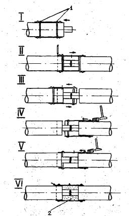 Рис. 4 Конструкция защитной муфты для теплоизоляции сварного стыка и порядок ее монтажа: I – VI - последовательность операций при монтаже; 1 - уплотнительное кольцо; 2-пенополиуретановая изоляция В качестве защитного покрытия можно применять термоусадочные муфты, конструктивные схемы которых приведены на рис. 5.