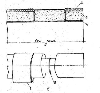 Рис. 5. Конструктивная схема теплоизоляции сварного стыка с помощью термоусадочной муфты: а - теплоизоляция стыка в собранном виде; б - промежуточное положение термоусадочной муфты; 1 - термоусадочная муфта; 2 - защитный кожух; 3 - теплоизоляция; 4 - труба; 5 - сварной стык Чтобы исключить возможность возгорания пенополиуретановой или пенополистирольной теплоизоляции, перед термоусадкой теплоизоляцию стыка следует обернуть лентой. 4.2. Теплоизоляционное покрытие может быть выполнено с покровным слоем из ленты. 4.2.1. Теплоизоляцию изготавливают из пенополиуретановых или пенополистирольных полуцилиндров, сегментов и других изделий. Покровный слой можно выполнять из двух слоев изоляционной ленты по п. 4.1.3 или одного слоя специальной ленты (например, Поликен-956-25). 4.2.2. Трубопровода с теплоизоляцией, указанной в п. 4.2.1, рекомендуется применять при укладке в необводняемую траншею или при канальной прокладке на участках, примыкающих к УКПГ, КС, НП и другим объектам. Канал может быть выполнен из железобетонных коробов, или плит (рис. 6,а), Конструктивные решения подземных трубопроводов с теплоизоляционными экранами и подсыпками 4.3 Теплоизоляция подземных трубопроводов с помощью экранов применяется для устранения возможности протаивания и осадки мерзлых грунтов основания при транспортировке горячих продуктов либо для устранения морозного пучения грунтов при транспортировке продукта с отрицательной температурой. 4.4. Теплоизоляционные экраны рекомендуется изготавливать из пенополиуретановых, пенополистирольных или торфяных плит (по п. 3.1), гидроизолированных битумами, мастиками, лентами и пленками по п. 3.6. 4.5. В зависимости от диаметра трубопровода, температуры транспортируемого продукта и особенностей состава мерзлых грунтов основания (например, льдистость) плиты можно укладывать либо только под трубу (рис. 6, б, г), либо под трубу и по боковым стенкам траншеи (рис. 6, в). Во всех случаях под трубопровод следует