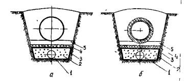 Рис. 7. Конструктивные схемы подземной прокладки теплоизолированных трубопроводов, уложенных в обводняемые траншеи: а - труба без теплоизоляционного покрытия; б - труба с теплоизоляционным покрытием; 1 - дренажная труба; 2 - керамзит; 3 - нетканый синтетический материал; 4 - теплоизоляция; 5 - подсыпка грунтовая 4.7. В случае транспортировки продукта с высокой температурой можно применять комбинированную теплоизоляцию: на керамзит, обернутый НМС, укладывают экраны (по пп. 4.4 - 4.5) и засыпают грунтовую "подушку". Трубопровод в этом случае может быть как
