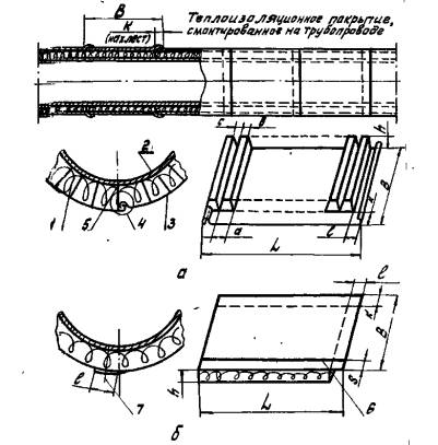 до ТМЭТ состоит из теплоизоляционных полос минеральной ваты пенополистирола, пенополиуретана и других материалов по п. 3.1. имеющих в поперечном сечении трапецеидальную ферму и приклеенных к покровному листу, из тонколистовой оцинкованной стали (ГОСТ 7118-78), а также деталей крепления. В конструкции ТМЭТ можно применять мягкие и полужесткие типы изоляционных, материалов в виде сплошных неразрезных плит и матов. ТМЭТ на трубопроводе закрепляют с помощью замка (рис. 8,а). Можно закреплять ТМЭТ также с помощью самонарезающих винтов или бандажей (рис. 8,б). 4.13. Для теплоизоляции надземных трубопроводов ТМЭТ специальными машинами обертывают вокруг трубопровода (покровным ливром вверх) и закрепляют с помощью замка, или винтами, или бандажами.