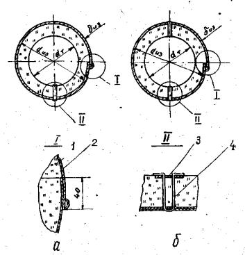Рис. 9. Крепление теплоизоляционного покрытия к покровному листу с помощью шплинта: а - при изоляции цилиндрами, матами и плитами; б - при изоляции полуцилиндрами; 1 - слой теплоизоляции; 2 - защитное покрытие; 3 - шайба; 4 - шплинт; 4.16. На вертикальных участках трубопроводов независимо от вида изоляции