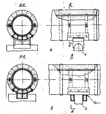 Рис. 2. Конструктивные схемы центровки двух типов: а - тип I; б - тип II При теплоизоляции, состоящей из смеси керамзита (или азерита) с перлитом, можно применять любой тип центратора. Кожух так же, как и труба, должен быть защищен от коррозии 4.1.5. Вариант II - теплоизоляция из минеральной ваты или стекловаты. Принципиально конструкция варианта II аналогична конструкции варианта I. Отличие заключается в том, что центраторы должны быть типа II (см. рис. 2).; Перед надеванием стального
