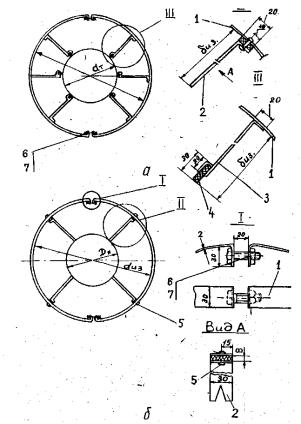 Рис. 14 Опорные кольца двух типов: а - тип I: б - тип II; 1 - хомут; 2 - лапка; 3 – лапка; 4 – опора; 5 - заклепка; 6 - болт; 7 - гайка