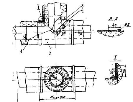 Отвода подземных трубопроводов поставляют на трассу с заводской теплоизоляцией. Отвода для трубопроводов диаметром от 529 до Теплоизоляционное покрытие отводов с теплоизоляцией из смеси керамзита (азерит) с перлитом или из минеральной ваты (стекловаты) можно изготавливать, как указано в пп. 4.1.4 и 4.1.5. с неразъемными наружными кожухами. Теплоизоляция отводов из пенополиуретановых или пенополистирольных полуцилиндров можно изготавливать с разъемным наружным кожухом (рис. 12). 4.22. Для теплоизоляции отводов надземных трубопроводов следует применять те же материалы, что и на прямолинейной части. Когда для изоляции прямолинейной части трубопровода применяют жесткие изделия, отвода теплоизолируют (в зависимости от диаметра) шнурами, жгутами или минераловатными или стекловатными изделиями на связках (п. 3.1). В качестве покрытия следует применять металлическое тонколистовое покрытие стальные или алюминиевые листы (п. 3.2). На рис. 13 приведена конструкция теплоизоляционного покрытия (кожуха) отвода с защитным металлическим листом. 4.23. Для теплоизоляции тройников необходимо применять тот же материал, что и при изоляции трубопровода. Если изоляция выполнена минераловатными или стекловатными изделиями, то защитное покрытие может быть изготовлено из металлических листов с креплением самонарезающими винтами (рис. 15). При изоляции тройников жесткими изделиями из пенополиуретана и пенополистирола наружный кожух может быть изготовлен из двух стальных сварных или штампованных половин, скрепляемых специальными замками. Обе половины кожуха поставляют на трассу с теплоизоляцией в собранном виде.