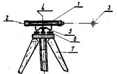Нивелиры§ 6. Нивелир состоит ив подставки, опирающейся на штатив и прикрепляемой в нему посредством станового винта; уровня для приведения инструмента в горизонтальное положение и зрительной трубы /с увеличением не менее 80 крат/ для взятия отсчетов по рейке. Для возможности определения расстояний зрительные трубы, как правило, снабжены нитяным дальномером. Кроме того, нивелиры снабжены приспособлениями для наведения на рейку, для закрепления зрительной трубы, а также для исправления нарушений юстировки инструментов. Схема нивелира приведена на рис. 1.