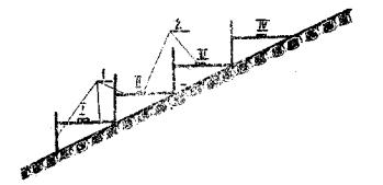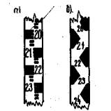труба. 2. Визирная ось. 3. Сетка нитей трубы. 4. Ось вращения инструмента. § 7. Нивелиры подразделяются на следующие типы: 1. глухие /НГ, HB-1 и др./; 2. глухие с поворотной трубой /полуглухие/; 3. со свободной /перекладной/ трубой /НТ, "Геофизикаи, "Геодезия" и др./: а/ с уровнен при подставке, б/ с уровнем при трубе; 4. с самоустанавливающейся линией визирования /НС-3, НСМ-2, НЗК/; 5. с наклонным лучом визирования /НЛ-3/. Наиболее совершенны те системы нивелиров, у которых обеспечена надежная связь трубы с уровнем, а все части инструментов лучше защищены от внешних влияний. § 8. У глухих нивелиров зрительная труба наглухо прикреплена к вертикальной оси вращения инструмента. В работе глухие нивелиры последних систем удобны тем, что позволяет одновременно вести отсчеты по рейке и наблюдать за положением уровня. § 9. У полуглухих нивелиров труба соединена с вертикальной осью вращения так, что, кроме поворота вокруг этой оси, она может поворачиваться на 180° вокруг своей геометрической /горизонтальной/ оси. Для окончательной установки в горизонтальное положение имеется элевационный винт. Уровень наглухо /сбоку/ прикреплен к трубе. § 10. У нивелиров со свободной /перекладной/ трубой к вертикальной оси вращения прикреплены вилкообразные подставки /лагеры/, на которые опирается труба своими кольцеобразными выступами /цапфами/. Трубу можно вынуть и переложить в лагерях или, не вынимая ее из лагер, повернуть вокруг геометрической оси на 180° /поворот в лагерах/. Трубу можно также переложить и повернуть в лагерах на 180°. Наиболее распространенный тип нивелира с перекладной трубой - нивелир с уровнем при подставке. § 11. Нивелиры с самоустанавливающейся линией визирования /с призменным, линзовым или зеркальным компенсатором/ выгодно отличаются от обычных нивелиров тем, что требуют меньшей затраты времени на установку, так как нивелировщик приводит нивелир в горизонтальное положение по уровню малой точности /с ценой деления порядка 2′-10′/ Окончательное приведение линий визирования в горизонтальное положение выполняется автоматически, упомянутыми компенсаторами. § 12. Нивелир с наклонным лучом позволяет непосредственно отсчитывать превышения до 20 м с одной стоянки, что удобно в сильно пересеченной местности. Однако шкала, по которой делается отсчет превышений, ограниченно освещена, что значительно сужает область его применения, особенно при нивелировании в лесу, а также в пасмурную погоду. Рейки нивелировочные§ 13. При нивелировании применяются цельные или составные /раздвижные, складные/ рейки, обычно длиной 3 и 4 м. На цельных рейках деления и цифры наносятся с обеих сторон. На одной стороне деления и цифры черные /счет их идет от нуля, совпадающего с пяткой рейки/, на другой стороне - красные /отсчет ведется от условного горизонта/. У составных реек деления и цифры наносятся обычно только на одной стороне и цвет их меняется через каждый метр. Обычно нивелировочные рейки имеют сантиметровые деления и отсчет по ним производится с точностью - 1 см; целесообразно также применение реев с дециметровыми делениями /рис. 2/. Ори нивелировании трассы с повышенной точностью /см. ниже §§ 41, 42/ отсчеты берутся с точностью - 1 мм.