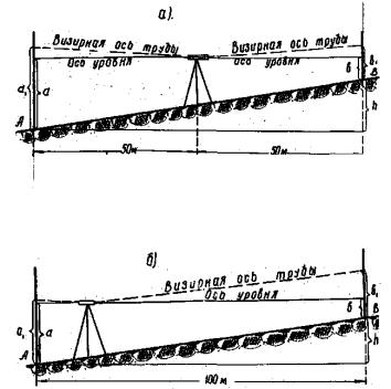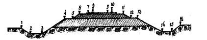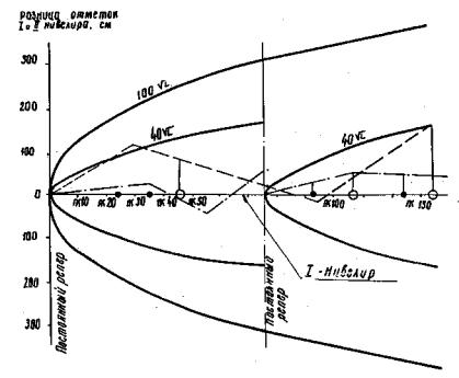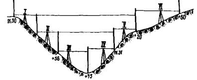 должна превышать V. НИВЕЛИРОВАНИЕ ТРАССЫ§ 43. Нивелирование трассы производится для определения превышений между точками, обозначающими их пикетное положение, и между характерными переломными точками местности. Нивелирование может быть одиночное или двойное. § 44. Одиночное нивелирование производится с применением двухсторонних реек, либо с изменением горизонта инструмента, применением контрольных точек или двойным ходом в прямом в обратном направлениях. § 45. При двойном нивелировании работа между I и II нивелировщиками распределяется следующим образом: I-й нивелировщик производит нивелирование пикетных и переломных /плюсовых/ точек трассы; привязку трассы к временным и постоянным реперам и маркам, а также к ходам смежных изыскательских партий; нивелирование для решения водоотвода; нивелирование живых сечений водотоков под мостами /при ходах по существующей дороге/. II-й нивелировщик осуществляет контрольное нивелирование по связующим точкам трассы и контроль всех привязок, а также нивелирование поперечников, пересекаемых сетей и коммуникаций, живых сечений, морфостворов, гидростворов и уклонов тальвегов и рек, причем эти работы могут производиться независимо от нивелирования трассы. § 46. Нивелирование, как правило, должно производиться из середины, при нормальных расстояниях от инструмента до рейки на связующих точках 100 м, с возможным увеличением расстояния до 150 м в условиях благоприятной погоды. Стоянки инструмента могут располагаться на трассе, а также в стороне от нее. § 47. Связующими точками могут служить пикеты или плюсы трассы. Все временные и постоянные реперы и марки, находящиеся в непосредственной близости от трассы, обязательно должны являться связующими точками. Если репер пропущен нивелировщиком или не был поставлен заблаговременно, то к нему делается отдельный привязочный ход. В случае привязки к маркам и реперам государственной нивелирной сети, удаленным от трассы, делаются специальные нивелировочные хода. § 48. Если с одной стоянки не удается взять превышения между соседними пикетными точками, то нивелирование производится по "иксовым" точкам, и пикетные точки в этих случаях могут быть промежуточными. Иксовыми точками может служить любой устойчивый предмет /пень, крупный камень, цоколь здания и т.п./, специально забитая точка или переносный нивелировочный башмак. § 49. При нивелировании трассы нивелировщик обязан следить за правильной порядковой нумерацией пикетов, проверять расстояния между ними шагами при переходе со стоянки на стоянку, или же определять расстояния до пикетов /а в сомнительных случаях и до плюсовых точек/ по дальномеру. § 50. I-й нивелировщик обязан следить за достаточностью точек на трассе, характеризующих рельеф местности. При пропуске пикетажистом характерных точек на местности нивелировщик должен занивелировать пропущенные точки, замерив расстояние от них до ближайшего пикетного колышка. Обо всех обнаруженных пропущенных и дополнительно взятых точках нивелировщик в тот же день сообщает пикетажисту для внесения соответствующих дополнений и изменений в полевые документы. § 51. Отметки связующих точек /с подведением постраничных итогов задних и передних взглядов/ вычисляются нивелировщиками в поле, в процессе нивелирования, обычно в то время, когда подносчик инструмент