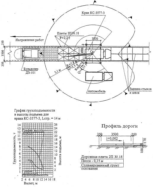 2.23 Картой предусмотрена укладка плит «с колес», без перегрузки плит в штабеля. 2.24 Монтаж плит покрытий надлежит начать с маячного ряда, располагаемого по оси покрытия при двускатном поперечном профиле покрытия и по краю - при односкатном поперечном профиле. Укладку плит предусмотрено выполнять самоходными кранами в направлении продольной оси покрытия. Монтаж плит выполняется в следующей последовательности: плита краном снимается с автомашины и наводится на место укладки с таким расчетом, чтобы подошва плиты оказалась на 3-5 см ниже поверхности уже уложенных смежных плит. Движением стрелы уменьшается до минимума зазор в поперечном шве между укладываемой и уложенной плитами. Наконец, плита опускается на песчаный слой с таким расчетом, чтобы она коснулась его одновременно всей подошвой. Продольные и поперечные швы должны совпадать, ширина швов между смежными плитами не должна превышать 20 мм, а уступ между плитами не более 5 мм. С целью обеспечения требуемой ровности покрытия плиты следует укладывать на выровненный песчаный слой. 2.25 Окончательная посадка плит на основании должна производиться путем прикатки покрытия гружеными автомобилями или катками на пневматических шинах до исчезновения видимых осадок плит. 2.26 После прикатки плита с гладкой опорной поверхностью должна иметь контакт с основанием (подстилающим слоем) по всей поверхности опирания. Площадь контакта проверяют визуально по отпечатку на песчаном основании после поднятия плиты. При положительном контакте основания с плитой последняя укладывается окончательно. 2.27 Завершающими процессами устройства сборного покрытия являются сварка стыковых скоб и герметизация швов. Для сварки применяется сварочный агрегат типа САК-2Г-IC, электроды типа Э-42А диаметром 4-5 мм. Сварка ведется непрерывным- швом длиной 8-9 см с катетом не менее 7 мм (шириной 0,5 диаметра скобы, высотой 0,25 диаметра с глубиной проварки не менее 5 мм). При зазорах между скобами более 4 мм на них накладывается стальной стержень диаметром на 2-3 мм больше зазора и приваривается с обеих сторон. Для образования швов расширения через каждые четыре плиты (24 м) скобы не должны свариваться. Герметизация швов выполняется следующими способами. За исключением швов расширения, поперечные швы на 2/3 глубины паза заполняются цементно-песчаным раствором, на 1/3 - битумно-полимерной мастикой. Швы расширения на всю глубину заполняются мастикой. Продольные швы при сварке монтажных скоб заполняются цементно-песчаным раствором на всю глубину шва. Заливка швов выполняется мастикой в два этапа: после оседания мастики при первой заливке швов доливается снова и излишек срезается заостренным резаком заподлицо с поверхностью покрытия. Схемы организации рабочих мест по устройству временной автодороги приведены на рисунках 2-4.