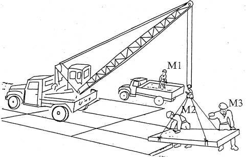 1, 2, 3 - монтажники; 4 - автокран; 5 - плитовоз ¬ -