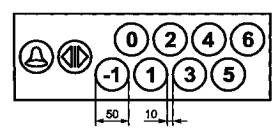 d) кнопки приказов на этажи при однорядном исполнении должны быть расположены слева направо на центральной линии панели аппарата управления лифтом. Слева от кнопок приказов на панели должны располагаться кнопки управления дверями и аварийная кнопка вызова. Аварийная кнопка вызова должна быть расположена над кнопкой управления дверями. Расстояние между рабочими поверхностями соседних кнопок должно быть 10 мм (см. рисунок G.2).