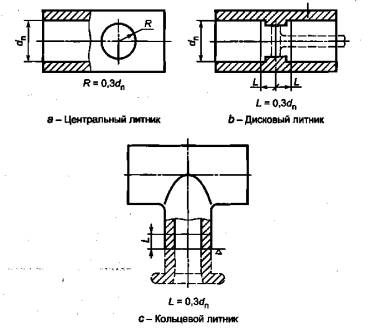 Рисунок 1 - Литниковые системы 4.3.6 Осматривают каждый испытуемый образец и регистрируют любые изменения поверхности, такие как трещины, расслоения и раскрытие линии спая потоков, изменения внутри стенки, например вздутия, а также изменения в зоне литника. Определяют степень таких дефектов в процентах от толщины стенки следующим образом: a) для изделий с центральным литником (рисунок 1) - в месте(ах) впрыска в пределах радиуса, указанного в стандарте на изделие или другом документе, при отсутствии указаний - R = 0,3dn, но не