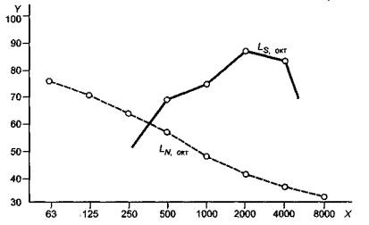 X-несущая частота октавы, Гц; У - уровень октавы L окт, дБ