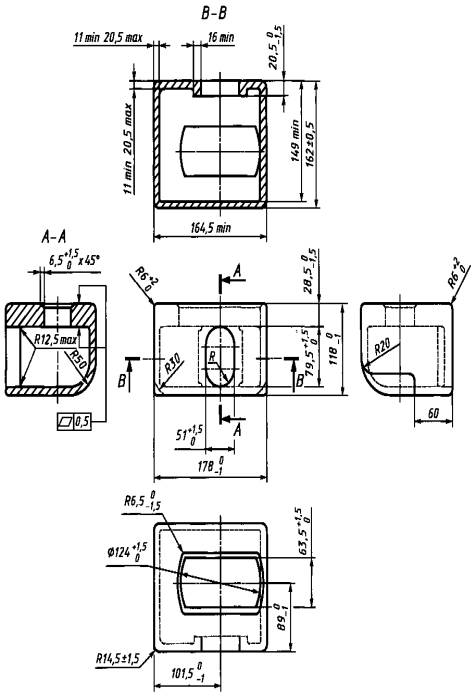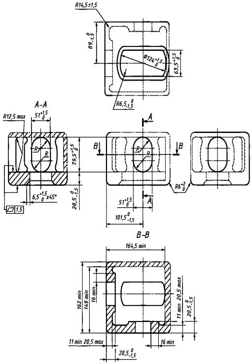 Дата введения - 2009-01-01 1 Область примененияНастоящий стандарт устанавливает основные размеры и требования к прочности угловых и промежуточных фитингов, предназначенных для грузовых контейнеров серии 1, соответствующих [1] и ГОСТ Р 51876. Настоящий стандарт не распространяется на угловые фитинги авиационных контейнеров [2]. 2 Нормативные ссылкиВ настоящем стандарте использованы нормативные ссылки на следующие стандарты: ГОСТ Р 51876-2002 (ИСО 1496-1-90) Контейнеры грузовые серии 1 Технические требования и методы испытаний. Часть 1. Контейнеры общего назначения (ИСО 1496-1:1990, MOD) ГОСТ Р 52202-2004 (ИСО 830-99) Контейнеры грузовые. Термины и определения (ИСО 830:1999, MOD) ГОСТ 977-88 Отливки стальные. Общие технические условия ГОСТ 9454-78 Металлы. Метод испытания на ударный изгиб при пониженных, комнатной и повышенных температурах ГОСТ 15150-69 Машины, приборы и другие технические изделия. Исполнения для различных климатических районов. Категории, условия эксплуатации, хранения и транспортирования в части воздействия климатических факторов внешней среды Примечание - При пользовании настоящим стандартом целесообразно проверить действие ссылочных стандартов в информационной системе общего пользования - на официальном сайте Федерального агентства по техническому регулированию и метрологии в сети Интернет или по ежегодно издаваемому информационному указателю «Национальные стандарты», который опубликован по состоянию на 1 января текущего года, и по соответствующим ежемесячно издаваемым информационным указателям, опубликованным в текущем году. Если ссылочный стандарт заменен (изменен), то при пользовании настоящим стандартом следует руководствоваться заменяющим (измененным) стандартом. Если ссылочный стандарт отменен без замены, то положение, в котором дана ссылка на него, применяется в части, не затрагивающей эту ссылку. 3 Термины и определенияВ настоящем стандарте применены термины по ГОСТ Р 52202, а также следующий термин с соответствующим определением: промежуточные фитинги: Элементы конструкции контейнеров типа Е, расположенные симметрично от вертикальной оси контейнера между угловыми фитингами на расстоянии, равном габаритным размерам контейнера типа А, и обеспечивающие установку, штабелирование, перегрузку и крепление контейнеров. 4 Требования к размерам4.1 Общие требования4.1.1 Размеры угловых нижних и верхних фитингов как правосторонних, так и левосторонних и допуски к ним должны соответствовать приведенным на рисунках 1 и 2. Каждый контейнер серии 1, кроме типа Е, должен иметь два верхних правосторонних и два верхних левосторонних угловых фитинга. Правосторонние и левосторонние фитинги определяют при размещении наблюдателя снаружи контейнера лицом против торца контейнера с дверями. Нижние угловые фитинги должны иметь аналогичную конструкцию, за исключением торцевого отверстия. На рисунках 1 и 2 изображены верхний и нижний правосторонние угловые фитинги; размеры левосторонних угловых фитингов соответственно идентичны. 4.1.2 Контейнеры типа Е, помимо указанных в 4.1.1 угловых фитингов, должны дополнительно иметь два верхних правосторонних и два верхних левосторонних (рисунок 3), и два нижних правосторонних, и два нижних левосторонних (рисунок 4) промежуточных фитинга, соответствующие габаритным размерам контейнера типа А. Общий вид контейнера т