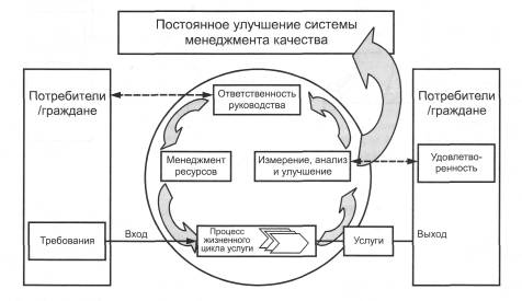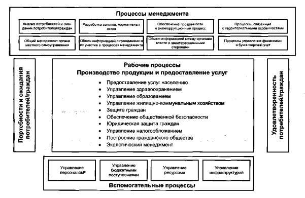 Рисунок 1 - Модель системы менеджмента качества, основанной на процессном подходе 0.2 Процессный подход в органах местного самоуправления Орган местного самоуправления должен применять процессный подход, определить виды процессов, необходимые для предоставления услуг удовлетворительного качества потребителям /гражданам. Существуют различные виды процессов, включая основные процессы, процессы менеджмента, операционные и вспомогательные процессы, которые должны обеспечить предоставление услуг необходимого качества. Для определения различных типов процессов, применяемых в органах местного самоуправления, см. 3.5. Для каждого процесса должны быть идентифицированы: - потребитель (получатель выхода процесса). Это может быть внутренний потребитель органа местного самоуправления, например другой департамент, или внешний потребитель, например гражданин, которому предоставляют услугу; - главные входы процесса (например, информация, требования законодательства, государственная и/или региональная правительственная политика, материальные, энергетические, человеческие и финансовые ресурсы); - ожидаемые выходы процесса (например, определение основных характеристик предоставляемых услуг); - средства управления, необходимые для верификации выполнения процесса и/или его результатов; - взаимодействие с другими процессами органа местного самоуправления (выходы одного процесса обычно являются входами в другие процессы). Примеры некоторых процессов в органах местного самоуправления: a) стратегические процессы управления, необходимые для определения роли органа местного самоуправления в социально-экономической среде; b) обеспечение ресурсами и способность к предоставлению услуг органа местного самоуправления; c) процессы управления производственной средой; d) подготовка, пересмотр и актуализация разработанных планов и рабочих программ; e) мониторинг и оценка процесса предоставления услуг; f) прозрачные внутренние и внешние процессы обмена информацией, содержащие механизмы вовлечения граждан, диалога с внутренними и внешними заинтересованными сторонами, а также помощи гражданам в понимании проблем и работы органа местного самоуправления; g) процессы, относящиеся к действиям в чрезвычайных и кризисных ситуациях. На рисунке 2 представлена модель системы качества органа местного самоуправления, основанная на процессном подходе.